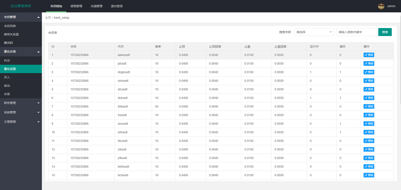 资金管理:系统默认使用TRC20-USDT或ERC20-USDT进行充提,充值为全自动,提现可以设置为手动或自动审核。