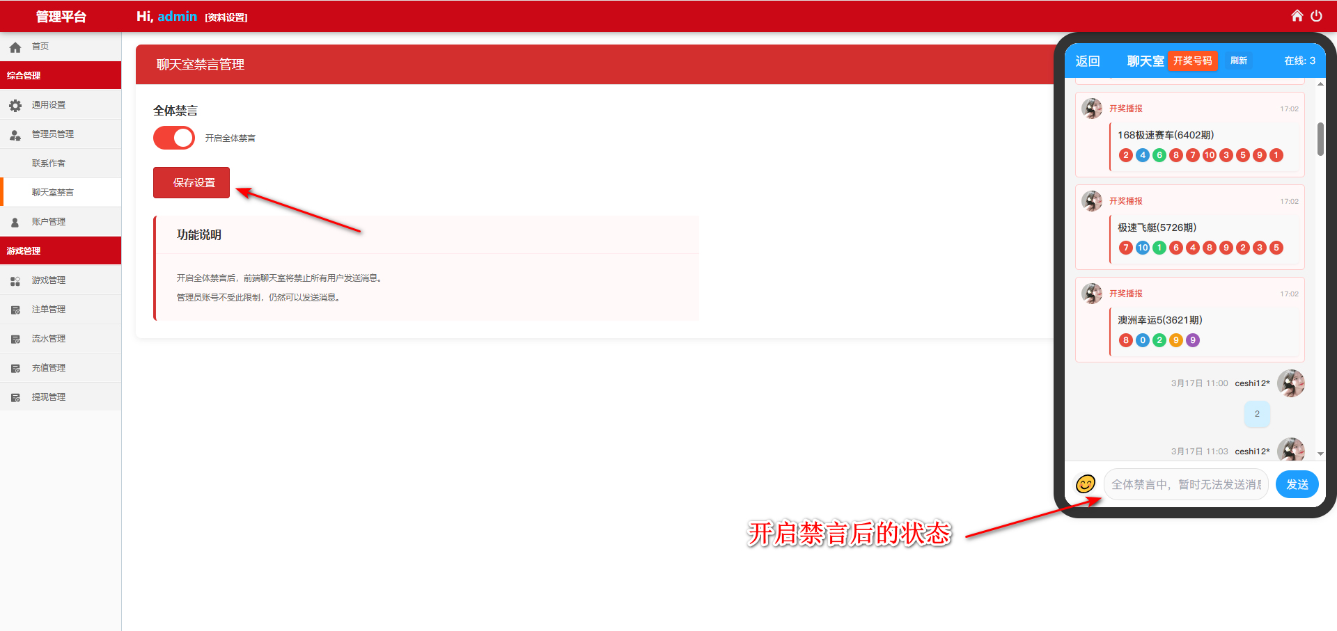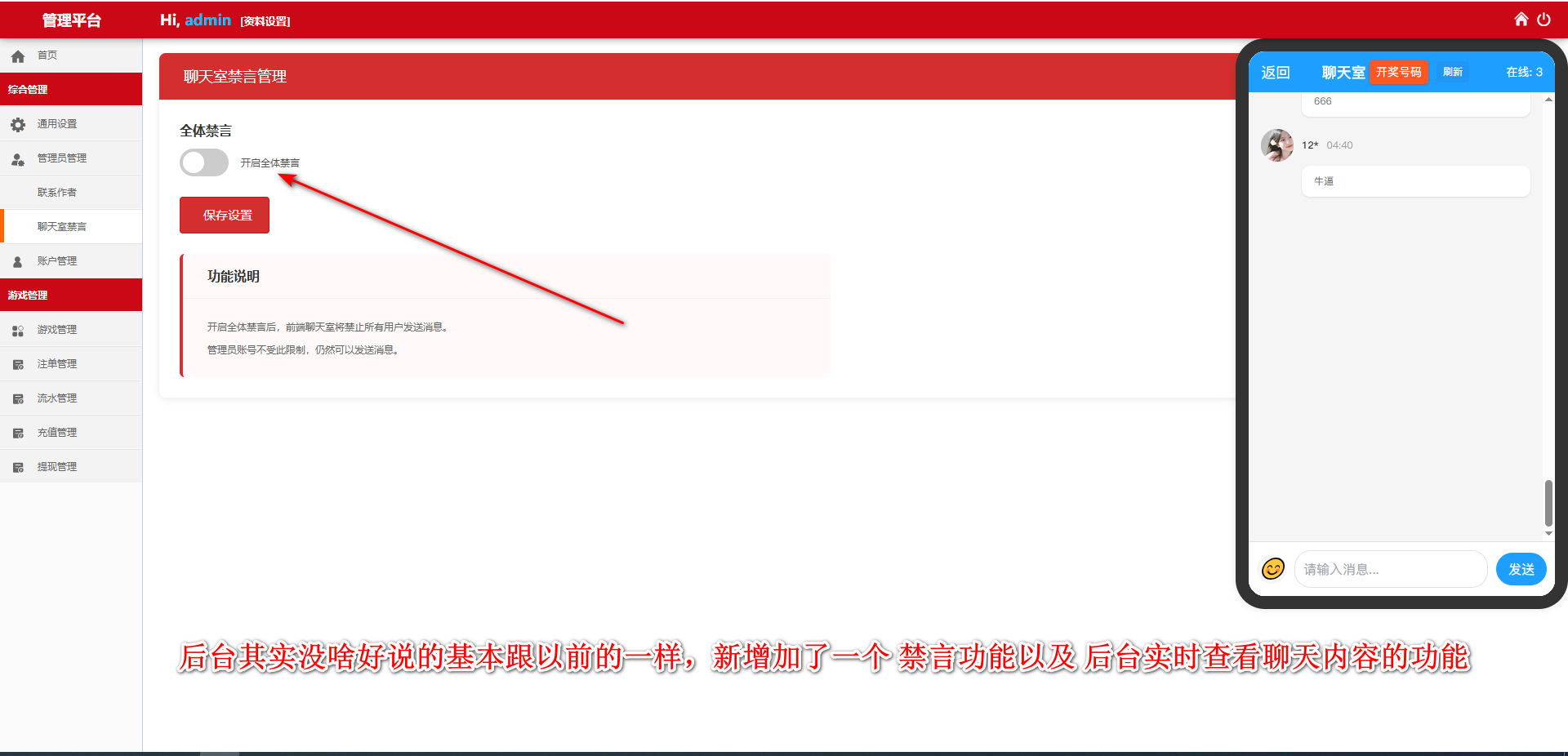 1:新增加了聊天室功能实现实时通信,在线聊天,后台可以设置全体禁言开关!聊天室内有开奖号码的播报!