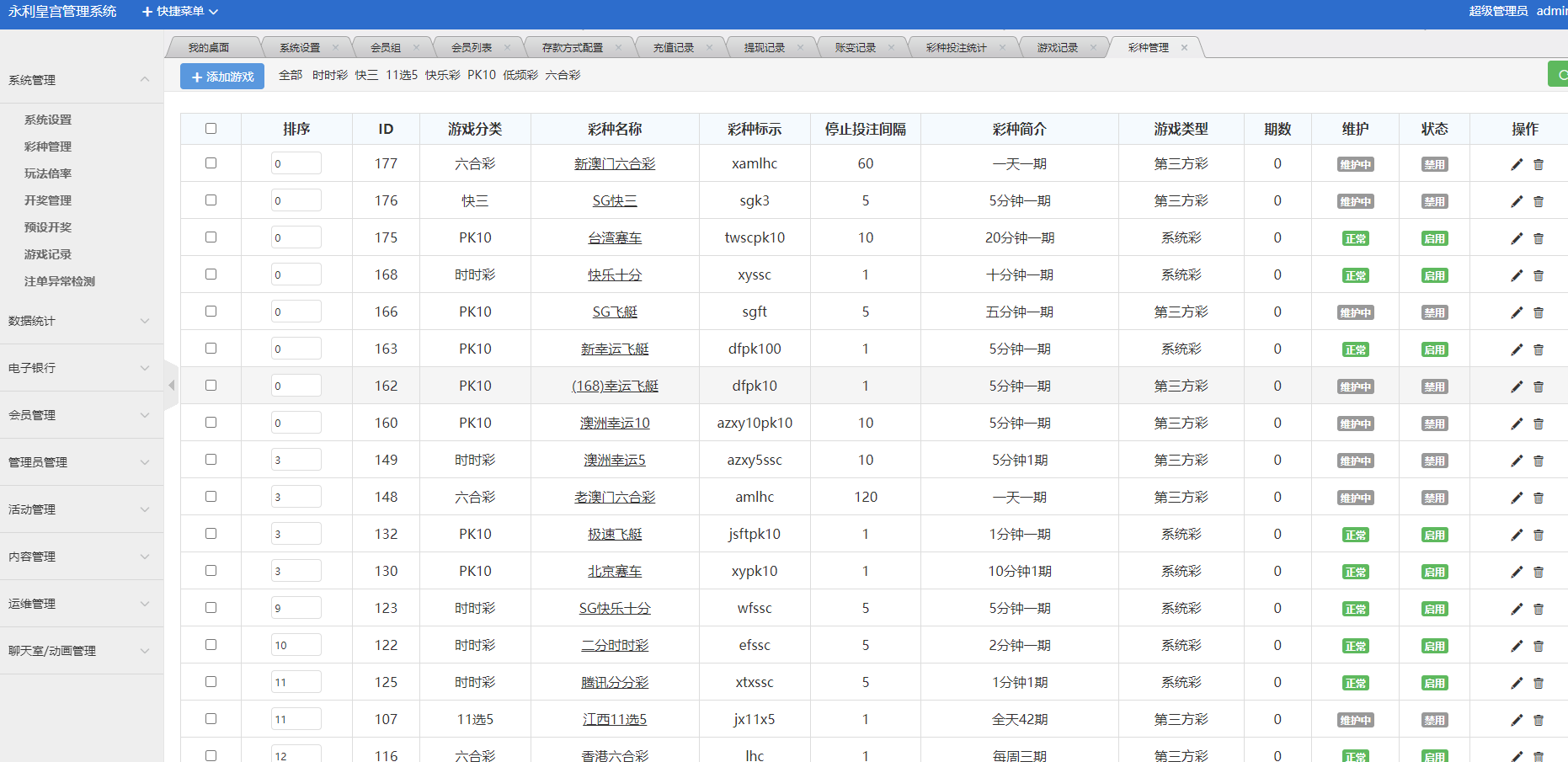 有很多彩种没打开,自行在后台开启 部分三方彩需要重新对接