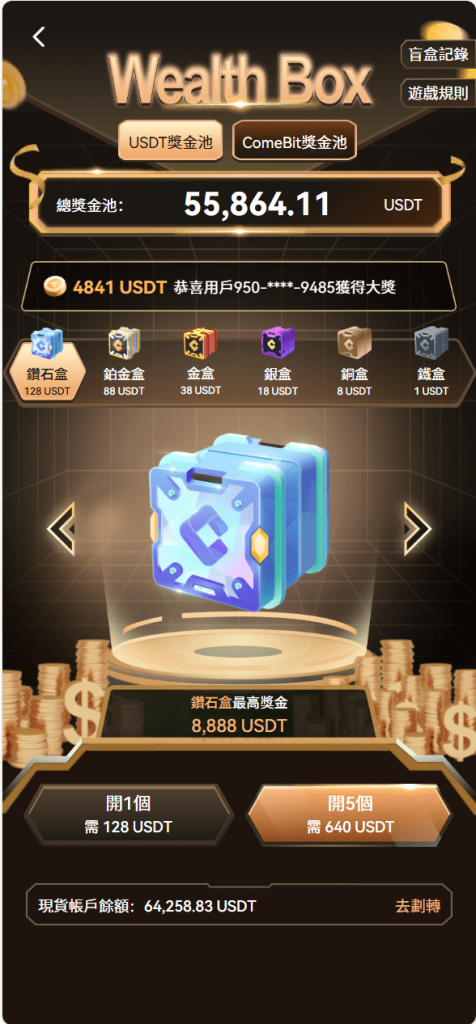 - 盲盒申购:创新的盲盒功能支持USDT及平台币双通道支付,提升用户参与感与趣味性。